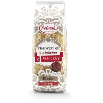 Kluski to najchętniej wybierany makaron spośród linii makaronów tradycyjnych firmy Polmak. Jest on produkowany w oparciu o dawną,sprawdzoną recepturę. Tak jak nasze babcie i mamy, wytwarzając ciasto dodajemy 4 jaja na 1 kg mąki pszennej. Nasz sposób produkcji,niezmienny od 50 lat został potwierdzony certyfikatem Jakość Tradycja. Kluski firmy Polmak to niezastapiony składnik tradycyjnych polskich zup jak rosół czy pomidorowa. Doskonale sprawdzą się również jako składnik dań dla dzieci.